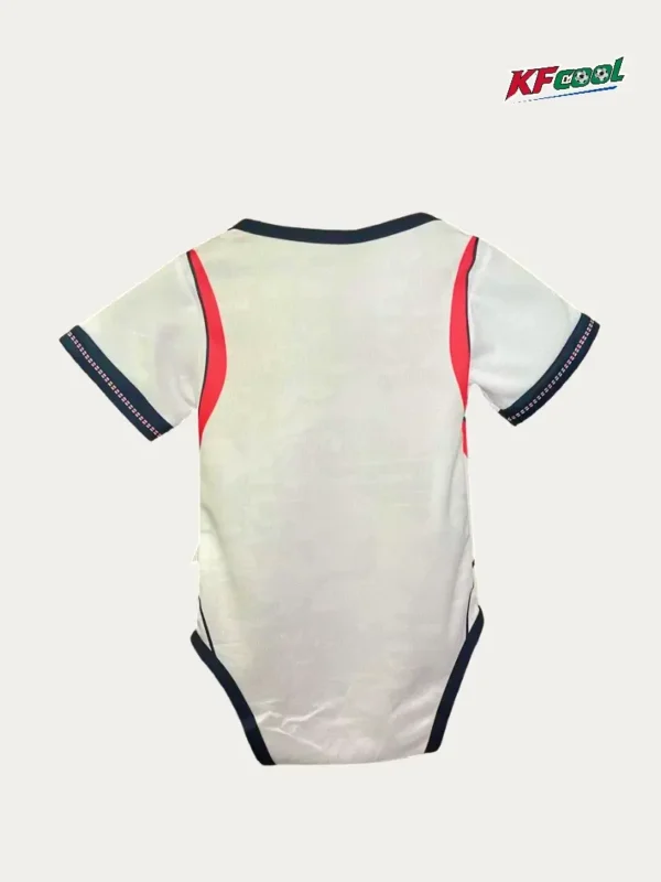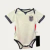 The England Home White Babysuit 26/27 offers soft breathable fabric and a comfortable fit for infants. Inspired by the England Jersey World Cup design, this piece reflects the England Jersey soccer style for young fans.