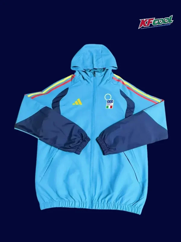 Lightweight Italy blue windbreaker designed for fans on the go. This italy national soccer team jacket offers wind protection and breathable comfort, ideal for matchdays, travel and casual outfits.